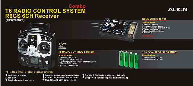 Компьютерная система радиоуправления ALIGN T6 (Futaba T6J). В режиме S-FHSS, частота обновления 6J составляет всего 6.8мс, также имеется память на 15 моделей, возможности настройки параметров шага + газа для самолетов и вертолетов, наряду с настройкой тарелки перекоса и другими функциями для вертолетов.